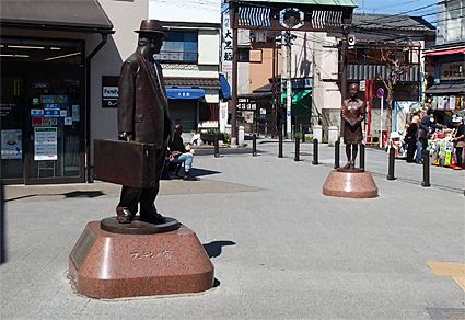 ![]() 【柴又駅前、寅次郎とさくらの像】 いきなり、「フーテンの寅」と妹「さくら」の像が出迎える。 |