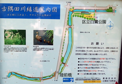 ![]() 【A4:古隅田川緑道、白鷺公園】 綾瀬川通りに併走する古隅田川緑道は、白鷺公園地点で東に向かう。 古隅田川緑道・小菅地区拡大図で見ると、本来、綾瀬川通りが古隅田川であるのだが、綾瀬駅周辺は暗渠化しているらしい。白鷺公園部分はバイパスをかねて古隅田川緑道としているようだ。 |