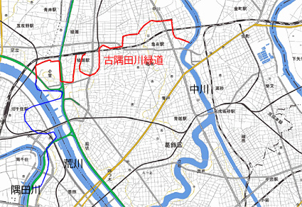 ![]() 【古隅田川・小菅地区拡大図】 古隅田川は、江戸期以前は、武蔵国と下総国の境界であったが、現在でも、足立区と葛飾区の境界として明瞭に残っている。 |