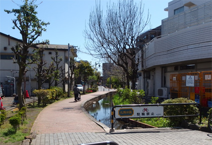 ![]() 【古隅田川緑道】 綾瀬川通りに架かる陸前橋を渡ると、古隅田川緑道はゆるやかに北に向かう。正面に「レンゴー」が見える。 |