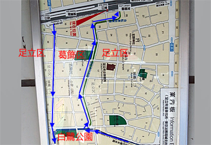 ![]() 【綾瀬駅前にあった案内板】 A7→A6:白鷺公園から綾瀬駅へ向かう旧河道は暗渠 A5→A4:綾瀬駅から白鷺公園へ向かう旧河道も暗渠 になり、A4→A7へとバイパス化されている。 暗渠化された旧河道の左右の住居表示を見てみると、左から、[足立区][葛飾区][足立区]と区境が読み取れる。 |