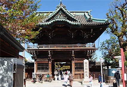 ![]() 【柴又帝釈天、二天門】 明治29年(1896年)の建立。入母屋造瓦葺の楼門(2階建て門)で、屋根には唐破風と千鳥破風を付す。柱上の貫などには浮き彫りの装飾彫刻を施す。初層左右には四天王のうちの増長天および広目天の二天を安置し、門の名はこれに由来する。二天像は平安時代の作とされ、門の建立時に同じ日蓮宗の妙国寺(大阪府堺市)から寄贈されたものである。(ウイキペディア) |