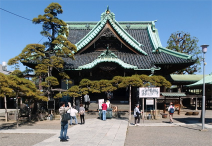 ![]() 【柴又帝釈天、帝釈堂】 二天門を入った境内正面に位置する。手前の拝殿と奥の内殿から成り、ともに入母屋造瓦葺で、拝殿屋根には唐破風と大ぶりの千鳥破風を付す。内殿は大正4年(1915年)、拝殿は昭和4年(1929年)の完成。内殿には帝釈天の板本尊を安置し、左右に四天王のうちの持国天と多聞天(毘沙門天)を安置する(四天王の残り2体は二天門に安置)。内殿外側には全面に浮き彫りの装飾彫刻が施されている。(ウイキペディア) |
