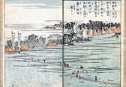 ![]() 【絵本江戸土産・帝釈天、広重】国立公文書館蔵 「帝釈天は柴又村にあり、庚申の日は都鄙の貴賎群参す。利根川を見越して鴻の臺の眺望最よし」と書かれている。 ・江戸末期、広重の見た柴又は、江戸川沿いの水郷地帯、水田の中の道、帝釈天へ向かう人々が描かれている。国府台の眺望が最高だった。 ・明治になってからも、この田園風景は暫く続いたらしい。 俳人・水原秋桜子も、若き日の葛飾の情景を「葛飾や桃の籬も水田べり」と詠んでいる。 (但し、この句の葛飾は、柴又とは限らない) |