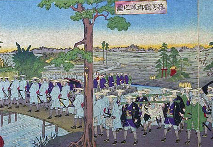 【幕府鶴御成之図 1889年 香蝶楼国貞】 葛飾区郷土と天文の博物館所蔵 明治になってから描かれた、鷹狩りの様子。捕獲した鶴2羽が運ばれていく様子が描かれている。 水辺が多く水鳥が集まる亀有・青戸・白鳥・四つ木では、飛んで来た鶴にえさをあげて鷹狩りの日まで飼っていた。鷹狩りでとる動物のうち、鶴が一番喜ばれた。 |