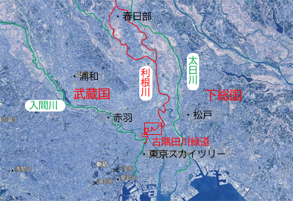 | [武蔵国と下総国] 中世以前の利根川下流(現在の古利根川)は東京湾へ注いでおり、概ね、東側が下総国、西側が武蔵国であった。 [下総国葛飾郡] 同時期に、渡良瀬川の下流(太日川ふといがわ)の流域両岸の地域が葛飾郡と定められた。ほぼ現在の江戸川の流域に当たる。東の境界は中世以前の常陸川、西の境界は中世以前の利根川の下流、北限は現在の茨城県古河市、南限は東京湾であり、南北に細長かった。 |