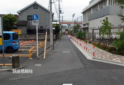![]() 【A6:暗渠となった古隅田川】 綾瀬駅直前で、右に曲がる。ここでは、古隅田川河道は区営自転車置き場になっている。 |